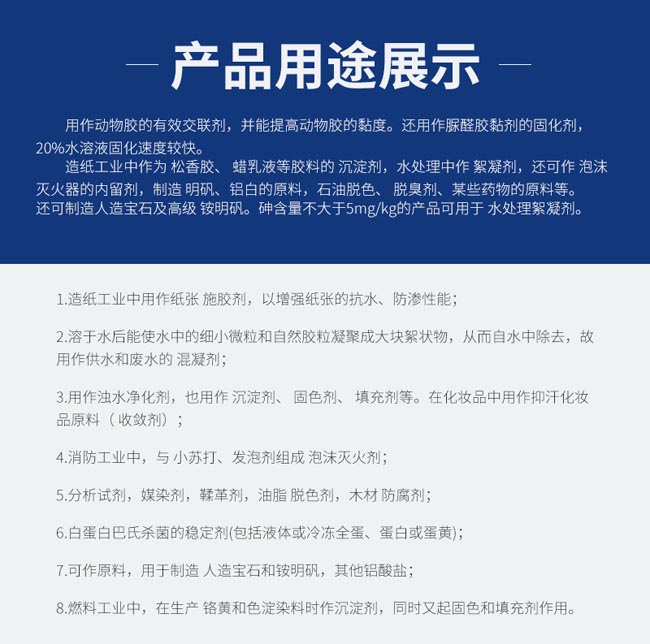 3.用作濁水凈化劑,也用作沉淀劑、固色劑、填充劑等。在化妝品中用作抑汗化妝品原料(收斂劑);